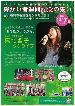 12月3日~12月9日の「障がい者週間」にちなんで、障害への理解と関心を深め、社会参加の意欲を高めてもらうために開催されるイベント。今年もクリスマスマーケットと同時開催され「シンガーソングライターmon(もん)さんのトーク&ライブ」が行われ、多くの人で賑わい、心温まる開催になりました。